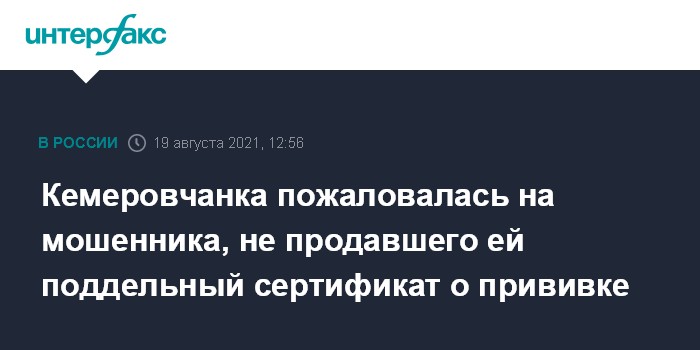 Москва. 19 августа. INTERFAX.RU - Полиция возбудила дело после заявления жительницы Междуреченска (Кемеровская область), которая хотела приобрести поддельный сертификат о вакцинации от коронавируса, но стала жертвой мошенника, также начата проверка в отношении самой женщины, сообщает в четверг пресс-служба главного управления МВД по региону.
