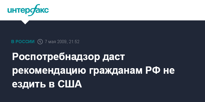 Москва. 7 мая. INTERFAX.RU - Роспотребнадзор в пятницу намерен дать рекомендацию российским гражданам воздержаться от поездок в США из-за ситуации с опасным гриппом H1N1.