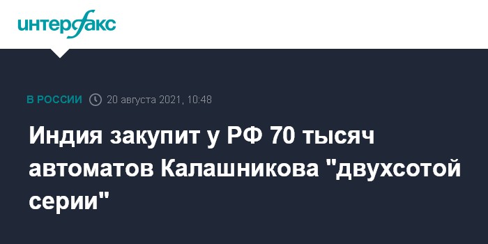 Москва. 20 августа. INTERFAX.RU - Индия в четверг подписала с Россией контракт на незамедлительную поставку готовых к использованию новейших автоматов Калашникова "двухсотой серии" количеством 70 тысяч единиц, сообщило онлайн-издание The Print.