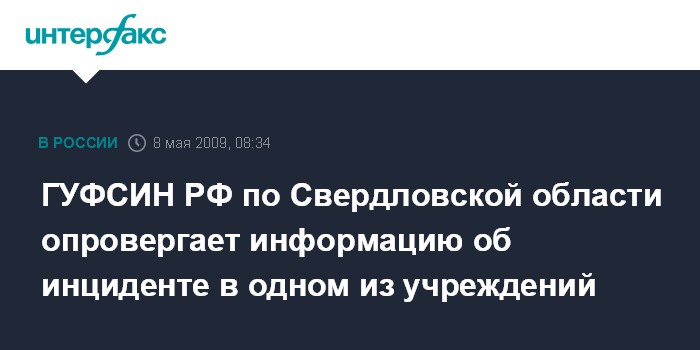 Москва. 8 мая. INTERFAX.RU - Главное управление ФСИН РФ по Свердловской области опровергает сообщения о том, что в СИЗО города Асбеста восемь человек порезали себе вены. "Никаких учреждений ГУФСИН РФ по Свердловской области в городе Асбесте нет. Обстановка в колониях и следственных изоляторах в других города контролируемая, никаких инцидентов нет", - сообщили агентству "Интерфакс-Урал" в пресс-службе ГУФСИН РФ по Свердловской области.