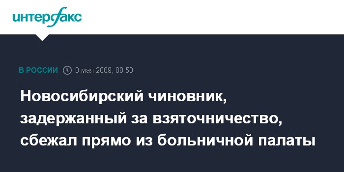Как сообщила в пятницу агентству "Интерфакс-Сибирь" старший помощник руководителя по связям со СМИ следственного управления СКП РФ по Новосибирской области Марина Кинжалова, задержанный чиновник по состоянию здоровья был помещен в городскую больницу Бердска. "В больнице подозреваемый находился в кардиологическом отделении", - пояснила Кинжалова. По ее словам, 7 мая в отношении чиновника Бердский городской суд избрал меру пресечения в виде заключения под стражу. "В тот же день около 23.30 часов подозреваемый сбежал из палаты больницы и скрылся", - сказала представитель следственного управления.
