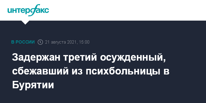 Москва. 21 августа. INTERFAX.RU - В Бурятии задержан третий участник побега из психоневрологического диспансера в селе Новая Брянь, сообщили журналистам в пресс-служба правительства республики.