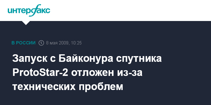 Москва. 8 мая. INTERFAX.RU - Старт ракеты-носителя "Протон-М" с телекоммуникационным спутником связи ProtoStar-2 с космодрома Байконур (Казахстан) перенесен с 14 мая на 16 мая, сообщил в пятницу агентству "Интерфакс" источник на космодроме. "Первоначально пуск планировался на 14 мая, однако при подготовке ракеты-носителя на техническом комплексе возникли проблемы, которые потребовали замены ряда блоков, в связи с этим график подготовки к пуску сместился", - сказал собеседник агентства.