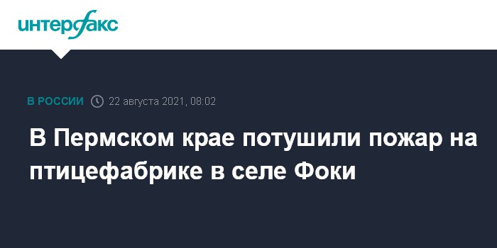 Москва. 22 августа. INTERFAX.RU - Спасатели ликвидировали крупное возгорание в цехе птицефабрики в селе Фоки Чайковского городского округа Пермского края, сообщает регионального управления МЧС в воскресенье.
