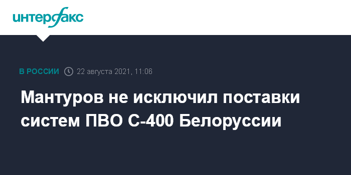 Москва. 22 августа. INTERFAX.RU - Системы С-400 "Триумф" могут быть поставлены Белоруссии для укрепления системы противовоздушной обороны (ПВО) союзного государства, сообщил в интервью "Интерфаксу" глава Минпромторга РФ Денис Мантуров.