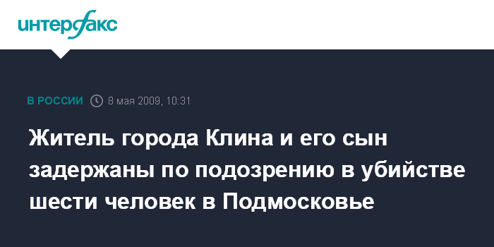 Москва. 8 мая. INTERFAX.RU - Задержаны подозреваемые в совершении убийства шести человек, совершенном на прошлой неделе в Подмосковье. Как сообщили "Интерфаксу" в пятницу в пресс-службе СКП РФ, это ранее судимый 39-летний житель города Клина и его 18-летний сын.