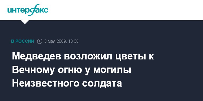 Москва. 8 мая. INTERFAX.RU - Президент России Дмитрий Медведев в честь Дня Победы в пятницу возложил венок к Вечному огню у могилы Неизвестного солдата в Александровском саду в Москве.