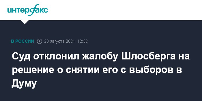 Как сообщалось, 9 августа Московский городской суд отменил регистрацию Шлосберга как кандидата от партии "Яблоко" в депутаты Госдумы по одномандатному округу номер 207 по Москве. Как сообщили ранее "Интерфаксу" в партии, было подано обращение в суд от партии "Зеленые" кандидата Пангаева (кандидата по этому же округу), оно было связано с ФБК (Фонд борьбы с коррупцией, запрещенная в РФ экстремистская организация, признана также иноагентом).