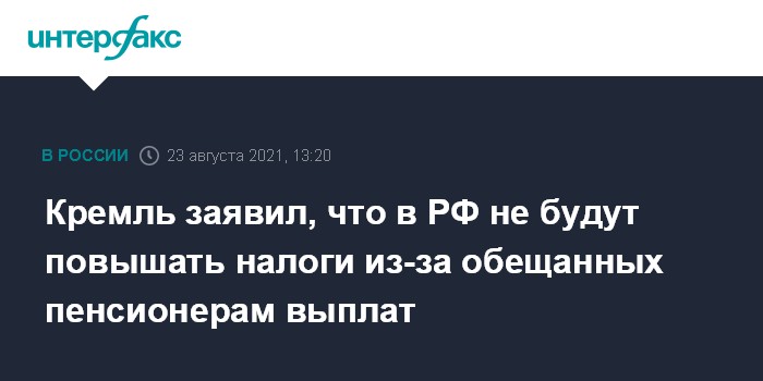 Кремль заявил, что в РФ не будут повышать налоги из-за обещанных пенсионерам выплат