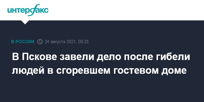 Москва. 24 августа. INTERFAX.RU - Следственные органы в Псковской области возбудили уголовное дело по факту гибели трех человек при пожаре в гостевом доме. Об этом сообщает пресс-служба регионального следственного управления СКР.
