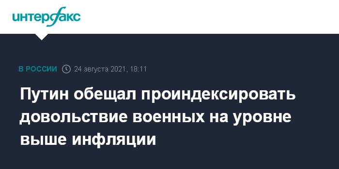 Москва. 24 августа. INTERFAX.RU - Президент Владимир Путин попросил Госдуму заложить в бюджеты 2022 и 2023 года индексацию довольствия военнослужащих и сотрудников правоохранительных органов на уровне выше инфляции. Он сказал это на пленарном заседании съезда "Единой России".
