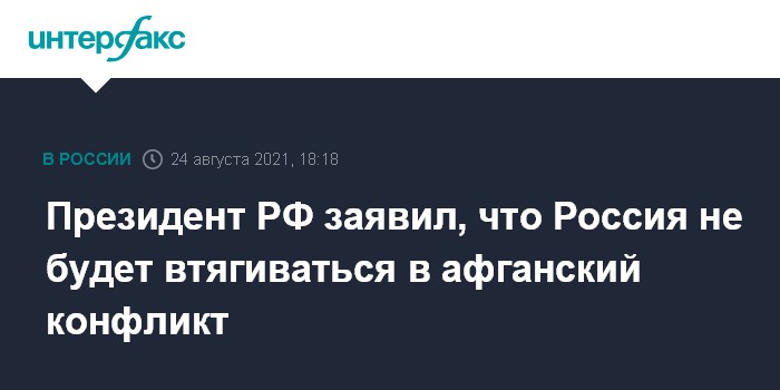 Москва. 24 августа. INTERFAX.RU - Президент РФ Владимир Путин заявил, что Россия не будет вмешиваться во внутренние дела Афганистана и втягивать свои вооруженные силы в конфликт в этой стране.