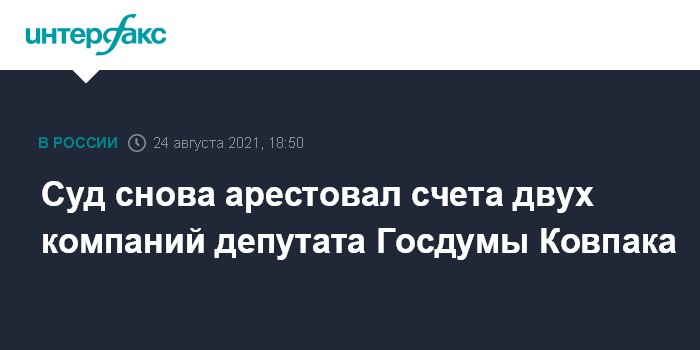 Москва. 24 августа. INTERFAX.RU - Арбитражный суд Свердловской области наложил арест на счета ООО "Прометей" и ООО "Лев", принадлежащих депутату Госдумы Льву Ковпаку и его отцу Игорю Ковпаку, на общую сумму более 54 млн рублей. Как говорится в картотеке суда, это обеспечительная мера по обособленному спору о признании сделок с компаниями недействительными.