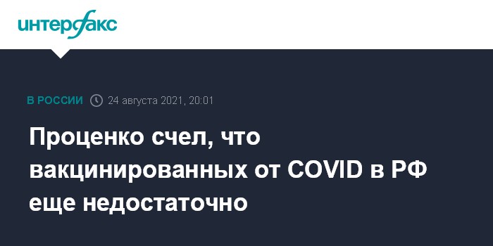 Москва. 24 августа. INTERFAX.RU - Доли вакцинированных от коронавируса в России пока недостаточно для создания коллективного иммунитета, этот показатель, по мнению специалистов, следует увеличить до 80%, заявил главврач больницы в Коммунарке Денис Проценко.