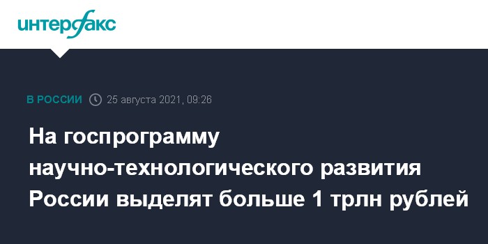Москва. 25 августа. INTERFAX.RU - Финансирование госпрограммы научно-технологического развития России (ГНПР) оценивается в 1 трлн рублей и будет увеличено, сообщил вице-премьер Дмитрий Чернышенко на форуме "Технопром-2021" в Новосибирске. По его словам, в программу собраны все направления, связанные с наукой в других госпрограммах.