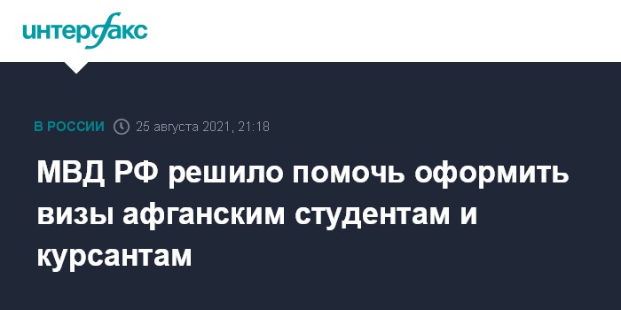 "В настоящее время на территории Российской Федерации находится более 1,6 тысяч граждан Исламской Республики Афганистан, которые проходят обучение в российских высших учебных заведениях. С учетом сложившейся обстановки в Афганистане с российской стороны при необходимости будет оказана визовая поддержка афганским студентам и курсантам, находящимся на территории РФ", - сказали в МВД России.