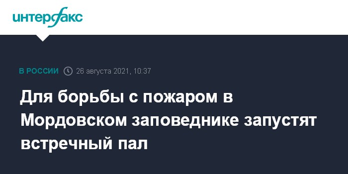 Москва. 26 августа. INTERFAX.RU - Пожарные продолжают борьбу с крупным возгоранием на территории Мордовского заповедника, для локализации одного из очагов запустят встречный пал, сообщил врио главы республики Артем Здунов.