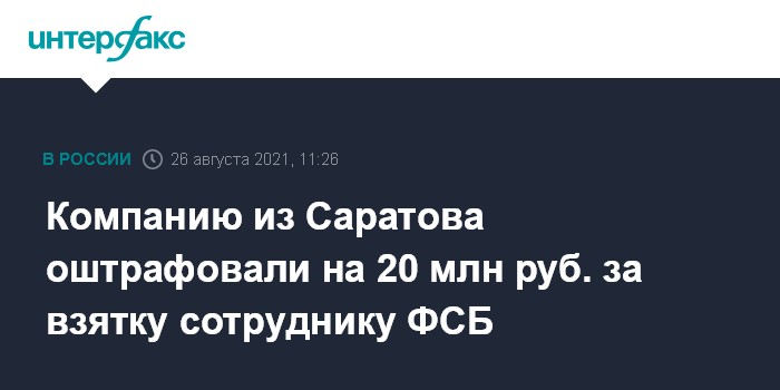 Москва. 26 августа. INTERFAX.RU - Прокуратура Фрунзенского района Саратова добилась наложения многомиллионного административного штрафа на строительную компанию за взятку сотруднику УФСБ. Об этом сообщается на сайте надзорного органа.
