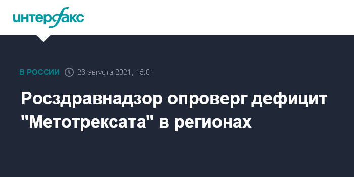 Москва. 26 августа. INTERFAX.RU - В регионах достаточно препарата "Метотрексат", необходимого для лечения ревматических заболеваний, заявили в пресс-службе Росздравнадзора. Так там отреагировали на публикацию "Ведомостей" о начавшемся в августе дефиците этого лекарства, необходимого для хронических больных.
