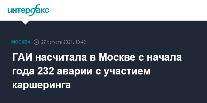 Москва. 27 августа. INTERFAX.RU - В Москве с начала года случились 232 аварии с участием автомобилей "каршеринга", в них погибли 14 человек и 279 получили травмы, сообщила пресс-служба столичного ГИБДД.