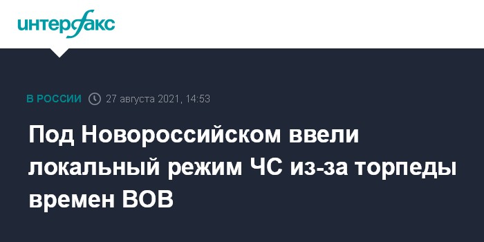 Москва. 27 августа. INTERFAX.RU - Локальный режим ЧС ввели под Новороссийском (Краснодарский край) из-за обнаруженной в прибрежной зоне Черного моря торпеды времен Великой Отечественной войны, сообщил в пятницу "Интерфаксу" информированный источник.