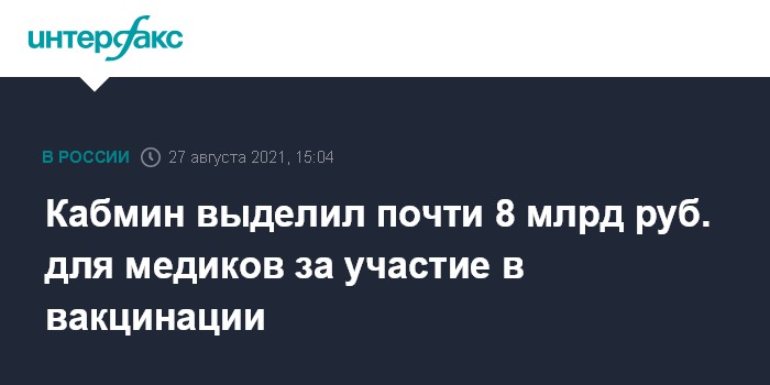 Москва. 27 августа. INTERFAX.RU - Правительство РФ выделило более 7,8 млрд рублей на стимулирующие выплаты и компенсации неиспользованных отпусков медицинским работникам, участвующим в вакцинации от коронавируса, соответствующее постановление подписал премьер-министр Михаил Мишустин.