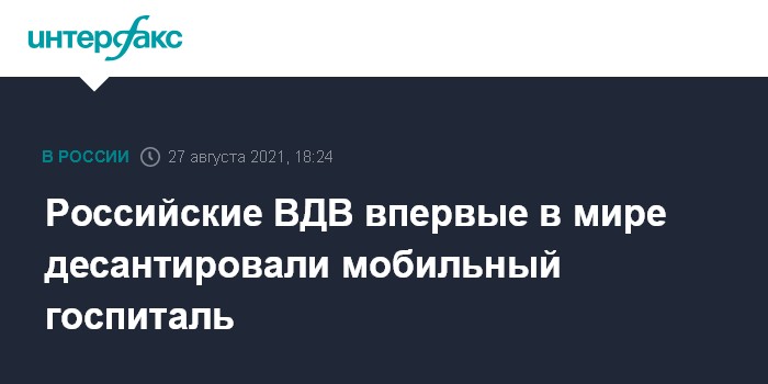 Москва. 27 августа. INTERFAX.RU - ВДВ России в рамках учения впервые в истории провели парашютное десантирование мобильного госпиталя, сообщили в департаменте информации Минобороны РФ.