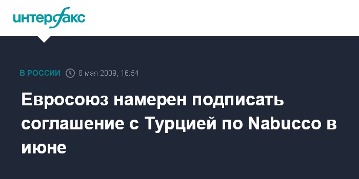 Москва. 8 мая. INTERFAX.RU - Евросоюз намерен подписать соглашение с Турцией по проекту строительства газопровода Nabucco в июне, заявил европейский комиссар по энергетическим вопросам Андрис Пиебалгс в ходе энергетического саммита в Праге.