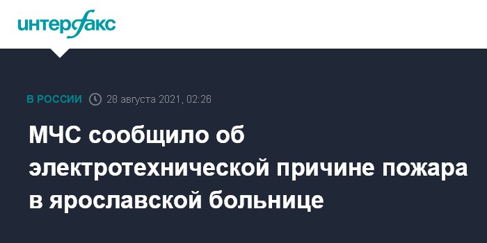 Москва. 28 августа. INTERFAX.RU - Пожар в клинической больнице №3 города Ярославля произошел, по предварительным данным, по электротехнической причине, сообщает пресс-служба регионального МЧС.
