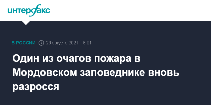 Москва. 28 августа. INTERFAX.RU - Площадь активного горения очага пожара в северо-восточной части Мордовского заповедника составила 110 га, сообщает пресс-служба республиканского ГУ МЧС России. Отмечается, что площадь, пройденная огнем - 5900 га.