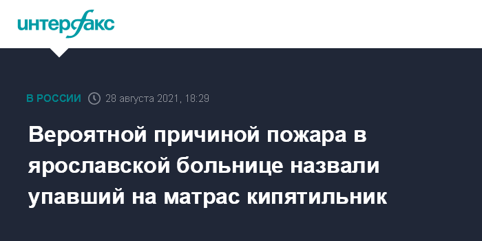 Москва. 28 августа. INTERFAX.RU - Следствие считает вероятной причиной пожара, который случился вечером 27 августа в больнице №3 Ярославля, где лечатся пациенты с коронавирусом, упавший на матрас кипятильник.