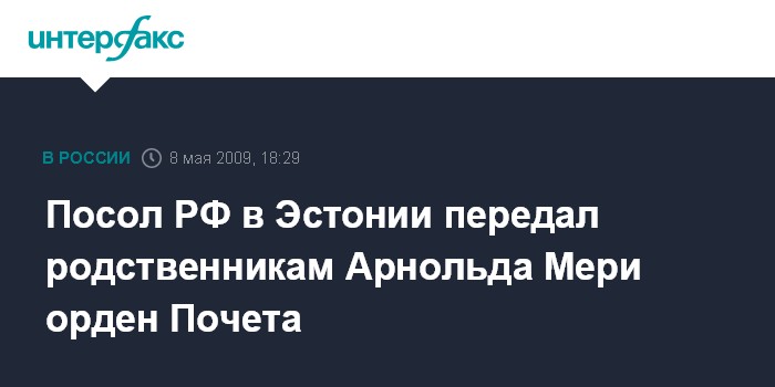 Таллин. 8 мая. INTERFAX.RU - Посол России в Эстонии Николай Успенский вручил орден Почета семье Героя Советского Союза Арнольда Мери (Arnold Meri).