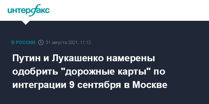 Путин и Лукашенко намерены одобрить "дорожные карты" по интеграции 9 сентября в Москве