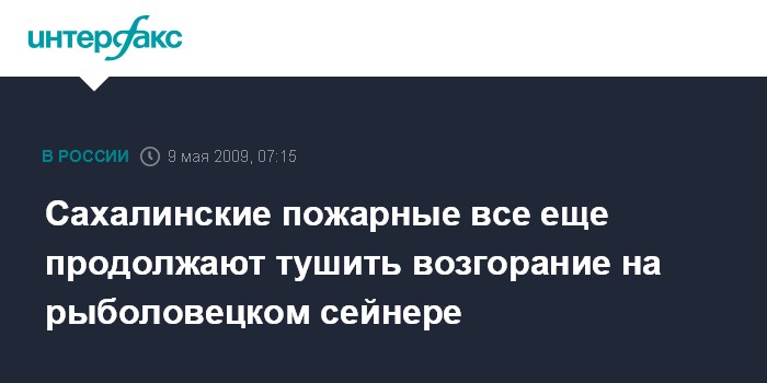 Южно-Сахалинск. 9 мая. ИНТЕРФАКС - ДАЛЬНИЙ ВОСТОК - Пожар на рыболовецком траулере МРТК "Инженер Нечухрин" (порт приписки Невельск, судовладелец ООО "Волна") не ликвидирован и продолжается до сих пор, уточнили агентству "Интерфакс - Дальний Восток" в службе наблюдения за флотом Невельского морского рыбного порта.