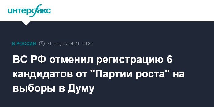 Москва. 31 августа. INTERFAX.RU - Верховный суд России во вторник принял решение об отмене регистрации шести кандидатов в депутаты в Госдуму восьмого созыва, включенных в список от "Партии роста".