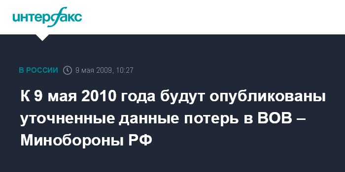Москва. 9 мая. INTERFAX.RU - Уточненные данные потерь советской армии в годы Великой Отечественной войны будут опубликованы к 65-й годовщине победы - к 9 мая 2010 года, сообщил "Интерфаксу-АВН" начальник управления Минобороны РФ по увековечиванию памяти погибших при защите Отечества генерал-майор Александр Кирилин.