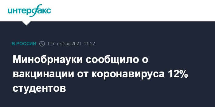 Москва. 1 сентября. INTERFAX.RU - В России привились от коронавируса чуть больше 45% сотрудников вузов и больше 12% студентов, сообщил НТВ министр науки и высшего образования Валерий Фальков сообщил, что более 45% сотрудников российских вузов привились от коронавируса.