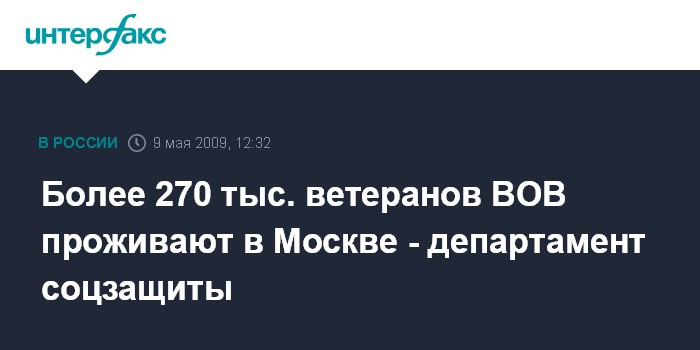 Он отметил, что по состоянию на апрель текущего года общая численность ветеранов Великой Отечественной войны, проживающих в Москве, составляет 272 тыс. человек. Из них около 13 тыс. инвалидов, 47,5 тыс. участников Великой Отечественной войны, а также около 207 тыс. тружеников тыла.