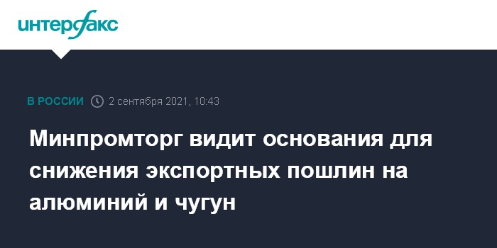 Москва. 2 сентября. INTERFAX.RU - Минпромторг видит основания для снижения экспортных пошлин на некоторые виды металлов, в том числе алюминий, чугун и ферросплавы, заявил журналистам на полях ВЭФ-2021 глава министерства Денис Мантуров.