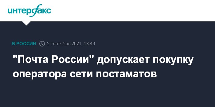 Москва. 2 сентября. INTERFAX.RU - АО "Почта России" допускает в перспективе возможность купить оператора сети постаматов, сообщил журналистам в кулуарах ВЭФ-2021 глава компании Максим Акимов.