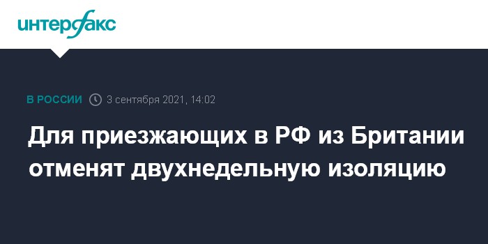 Москва. 3 сентября. INTERFAX.RU - Для приезжающих в Россию из Великобритании с 4 сентября отменяется обязательная двухнедельная изоляция, следует из постановления главного государственного санитарного врача РФ Анны Поповой.