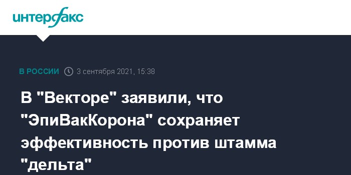Москва. 3 сентября. INTERFAX.RU - Научный центр "Вектор" Роспотребнадзора не видит оснований для снижения эффективности своей вакцины от COVID-19 "ЭпиВакКорона" против штамма коронавируса "дельта", сообщила "Интерфаксу" заместитель генерального директора учреждения Татьяна Непомнящих.