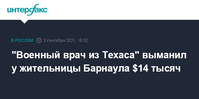 Москва. 3 сентября. INTERFAX.RU - В Алтайском крае возбуждено уголовное дело в отношении лже-военврача из Техаса Рассела Джонни, который через сайт знакомств вступил в переписку с 56-летней жительницей Барнаула, взял у нее в долг $14 тысяч и перестал выходить на связь, сообщили в региональном управлении МВД.