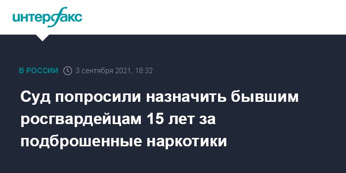 Москва. 3 сентября. INTERFAX.RU - В Петербурге прокурор попросил Красногвардейский суд приговорить к 15 годам колонии строгого режима двух бывших сотрудников вневедомственной охраны Росгвардии по делу о подброшенных 16-летнему подростку наркотиках и оштрафовать каждого на 2 млн рублей. Об этом "Интерфаксу" сообщил адвокат потерпевшего Дмитрий Герасимов.