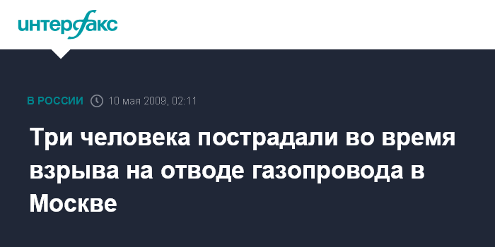 Москва. 10 мая. INTERFAX.RU - По предварительным данным, в результате пожара на отводе распределительного газопровода на юго-западе Москвы пострадали три человека, все они госпитализированы.
