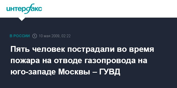 Москва. 10 мая. INTERFAX.RU - Во время пожара на отводе распределительного газопровода в районе улицы Большая Очаковская, на юго-западе Москвы пострадали 5 человек, сообщил"Интерфаксу" источник в медицинских кругах столицы.