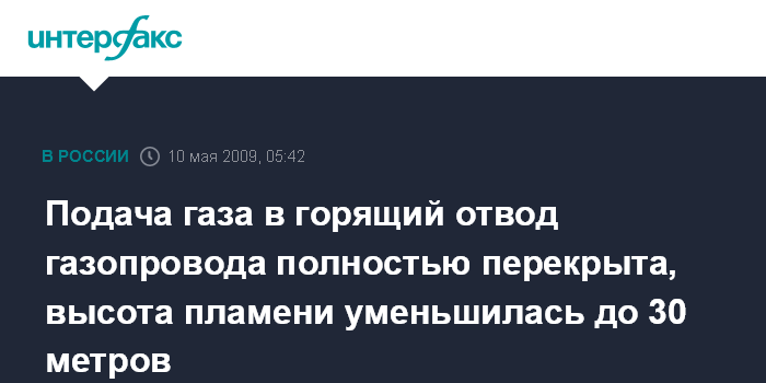 Москва. 10 мая. INTERFAX.RU - Факел над местом разрыва отвода распределительного газопровода на юго-западе Москвы уменьшился с 200 до 30 метров, сообщает корреспондент "Интерфакса" с места аварии. Как сообщил агентству источник в столичных правоохранительных органах, "в настоящий момент все задвижки закрыты, остатки газа в трубопроводе постепенно выгорают".
