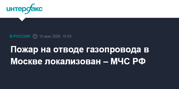 Москва. 10 мая. INTERFAX.RU - Пожар на отводе распределительного газопровода в Москве локализован, сообщили в МЧС России в воскресенье утром.