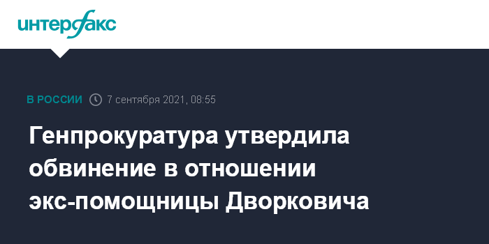 Москва. 7 сентября. INTERFAX.RU - Генеральная прокуратура РФ утвердила обвинительное заключение и направила в суд уголовное дело в отношении Анастасии Алексеевой – экс-помощницы бывшего заместителя председателя правительства РФ Аркадия Дворковича, обвиняемой во взяточничестве.