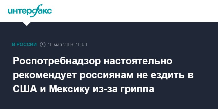 Москва. 10 мая. INTERFAX.RU - Медики по-прежнему рекомендуют российским гражданам воздержаться от поездок в Мексику и США из-за сложной ситуации с опасным гриппом H1N1.